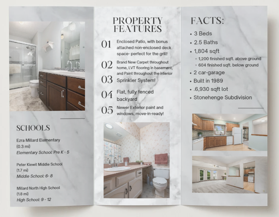Booklet Components – Booklet components are subject to materials provided by the agent or available through MLS. If certain elements (such as floor plans) are not accessible, the booklet will be formatted using the available listing components.